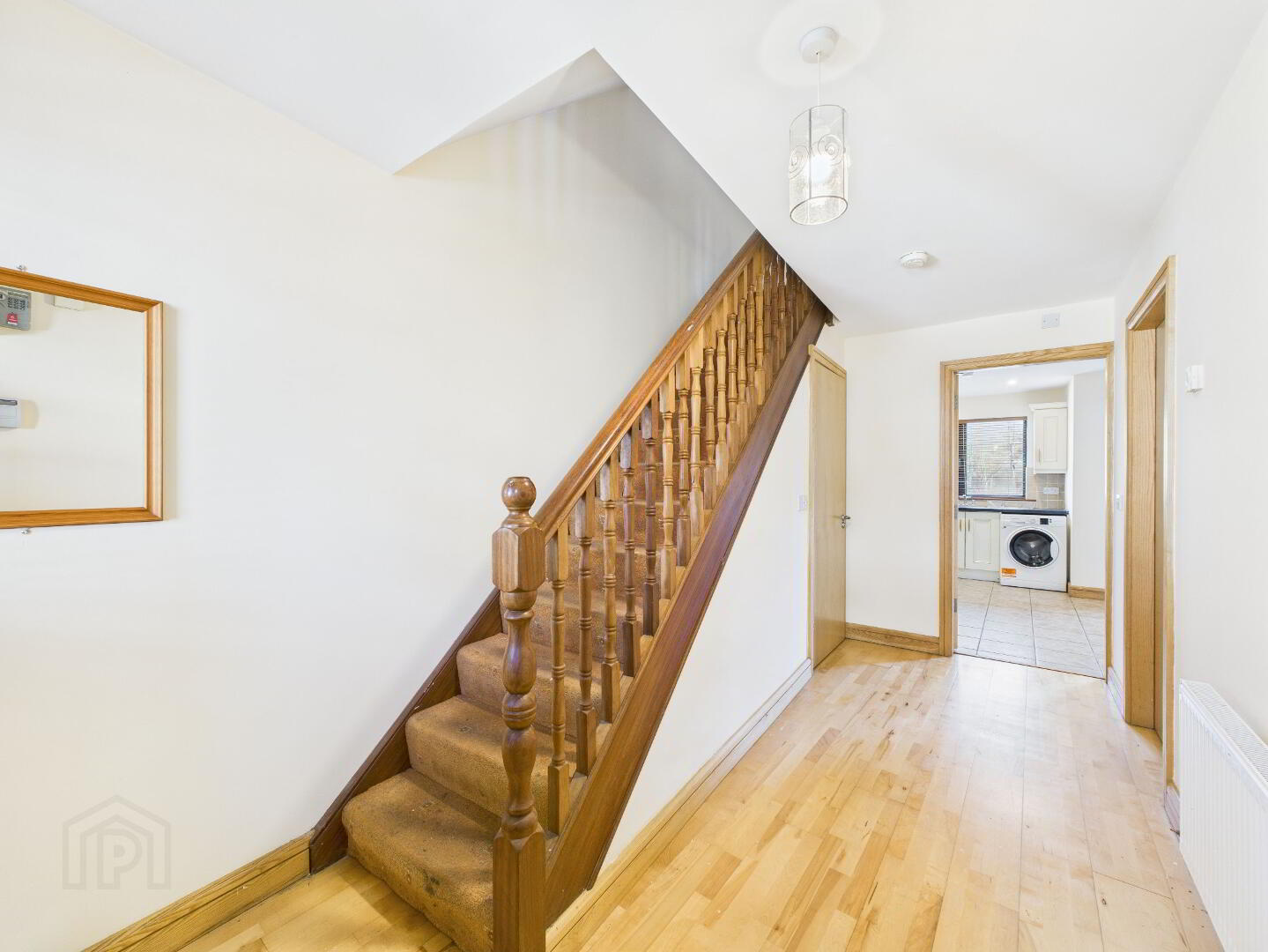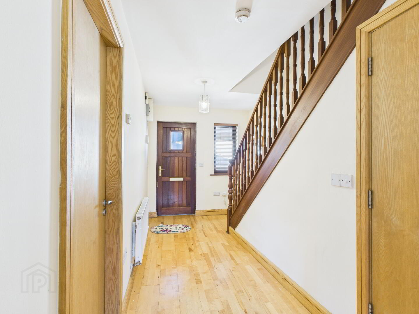 Spacious entrance hall with solid teak entrance door with glass panel and side window. Timber flooring. Radiator.