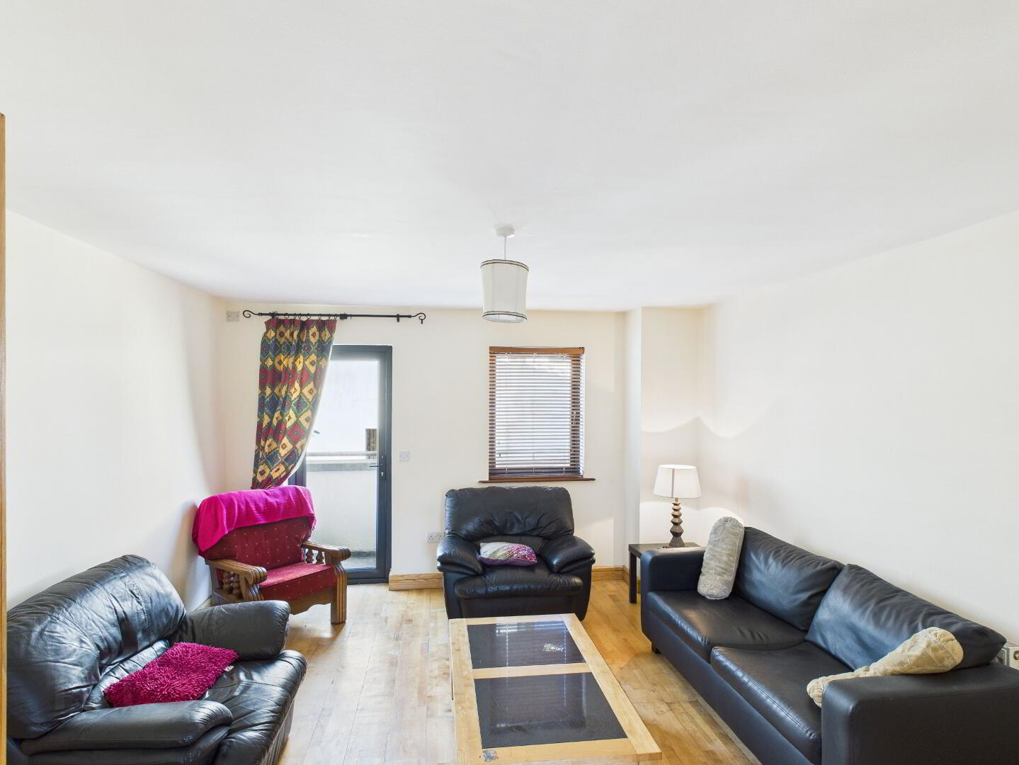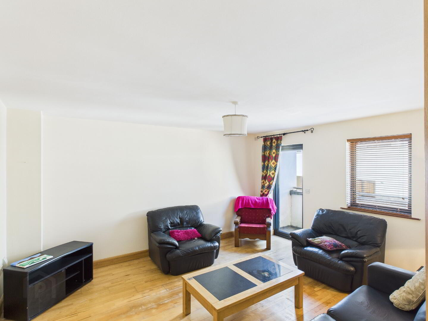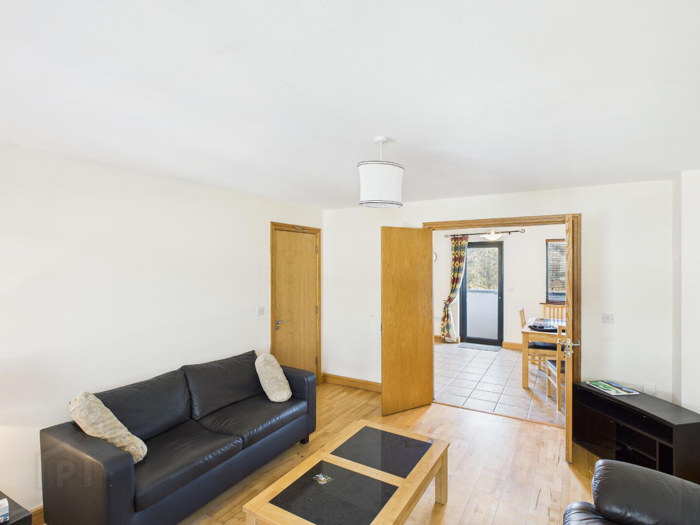 Timber flooring. Radiator. Window. Door to balcony. Double doors leading to the kitchen-dining area.