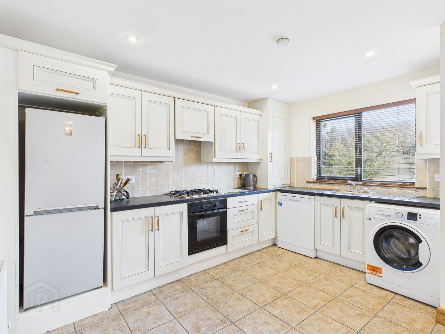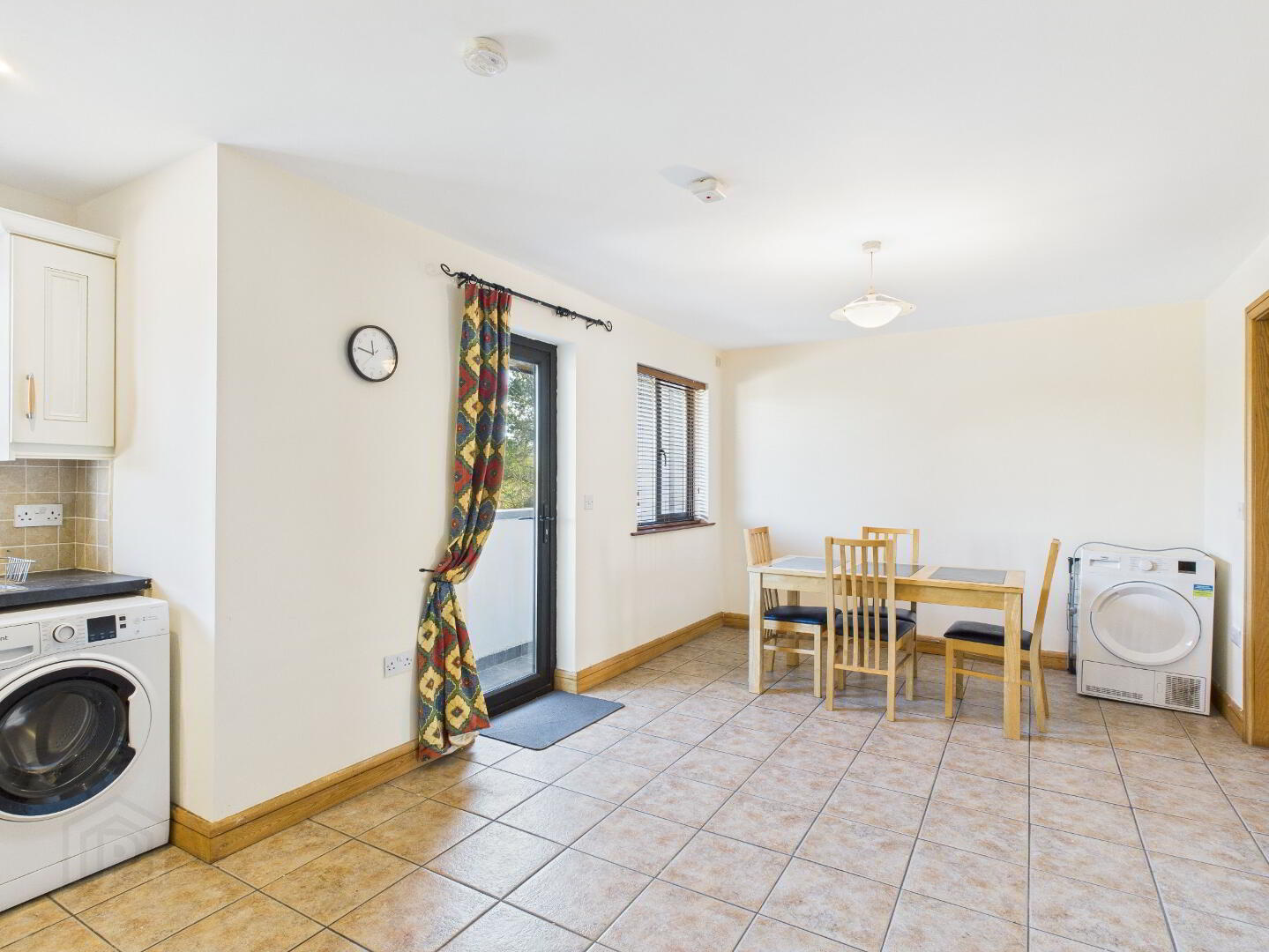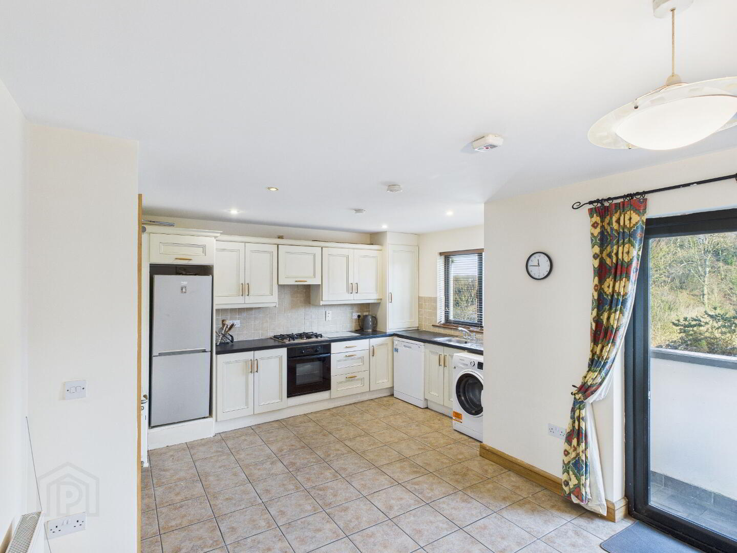 Fully fitted modern kitchen wall and floor units. Stainless steel sink with hot and cold. Tiled splashback. Built in oven, Gas hob and extractor fan. Plumbed for washing machine and dishwasher. Window. Radiator. Tiled flooring. Recessed lighting. Large radiator. Door to balcony. Window.