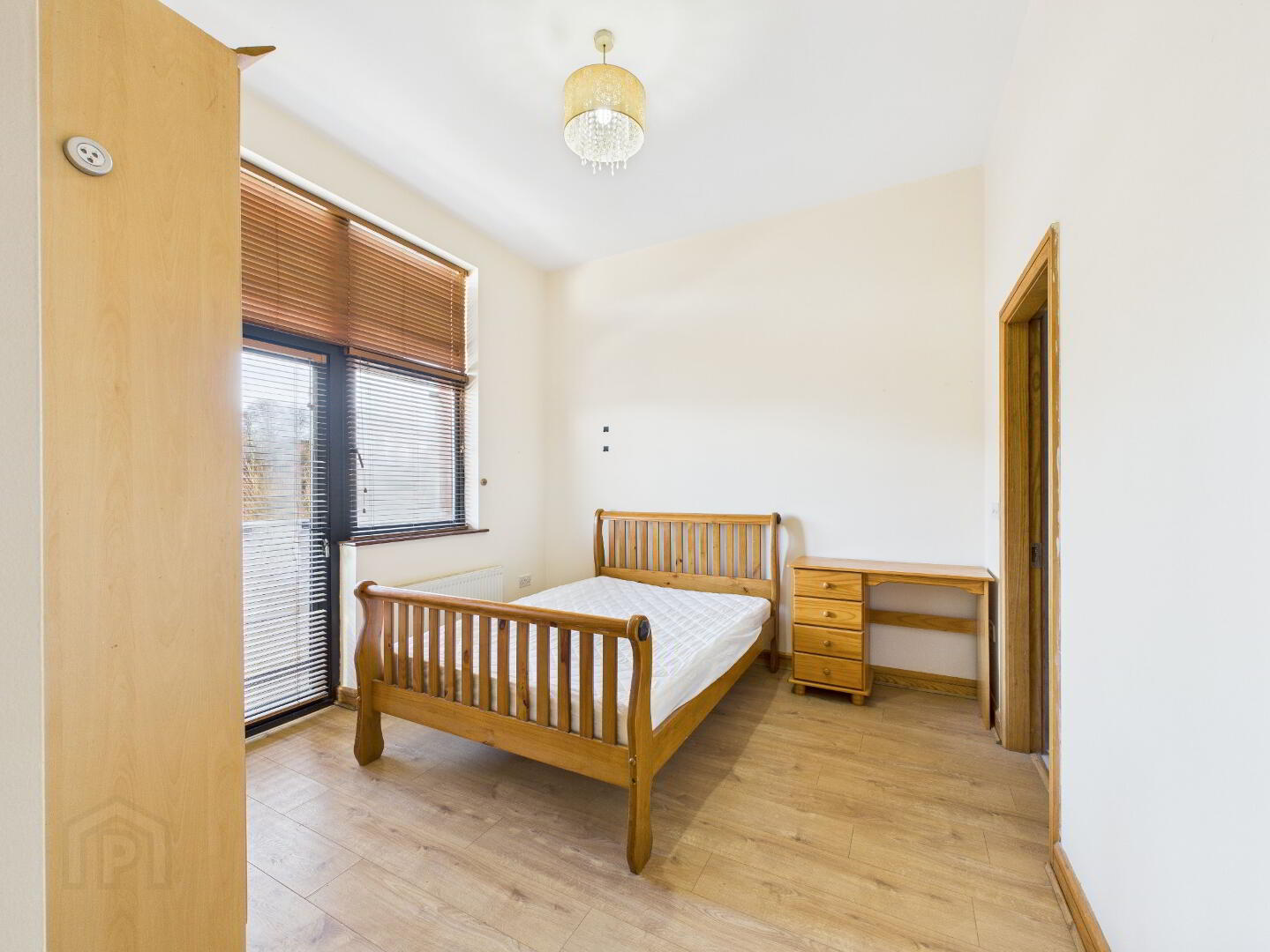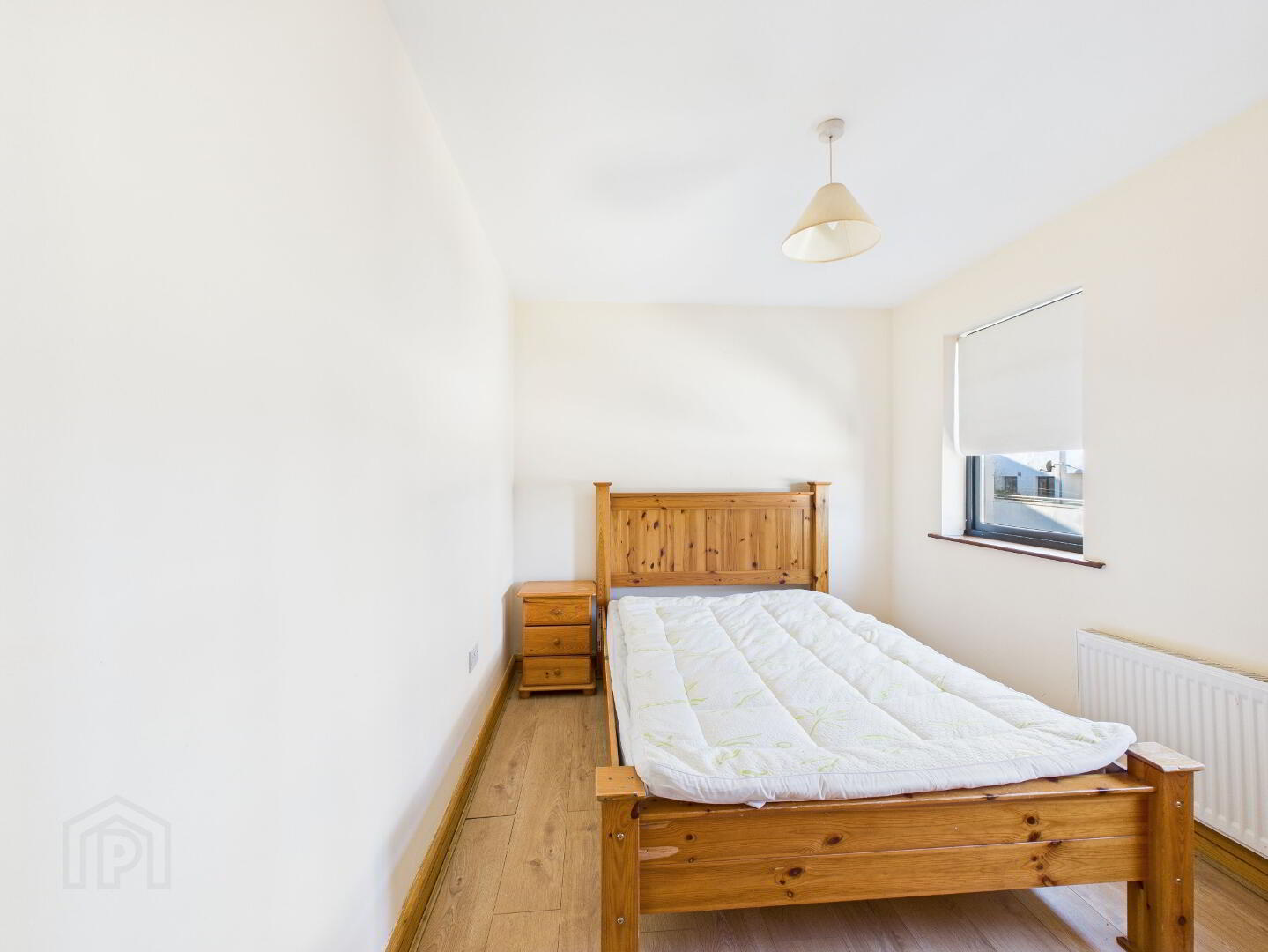 Timber flooring. Window with blinds. Radiator.