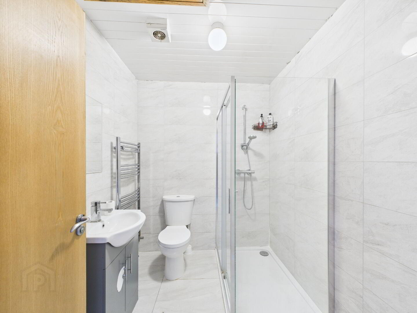 Recently refurbished to a high standard. Fully tiled walls and floor. Toilet and vanity unit with mirror. Towel radiator. Walkin fully tiled shower unit with pump shower.