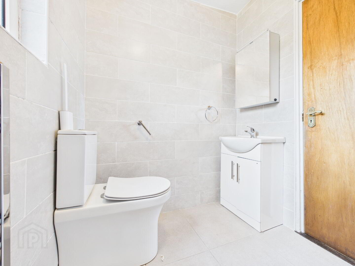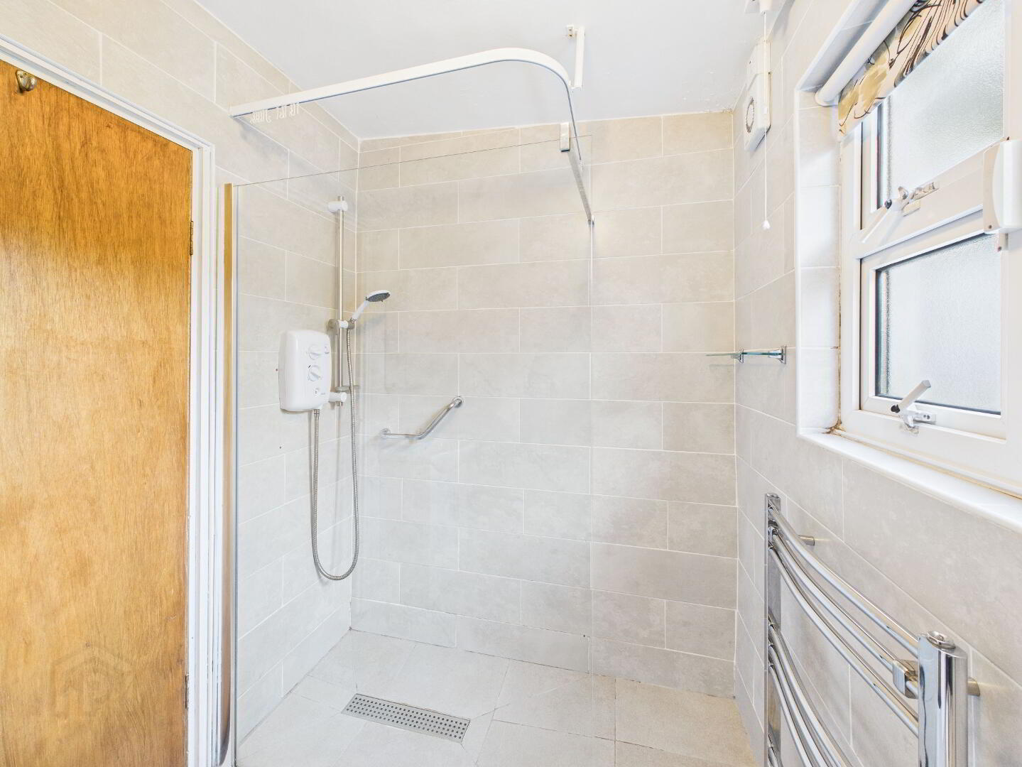 Fully tiled walls and floor. Toilet and wash hand basin. Shower unit with electric shower. Has disability access. Radiator. Three windows.