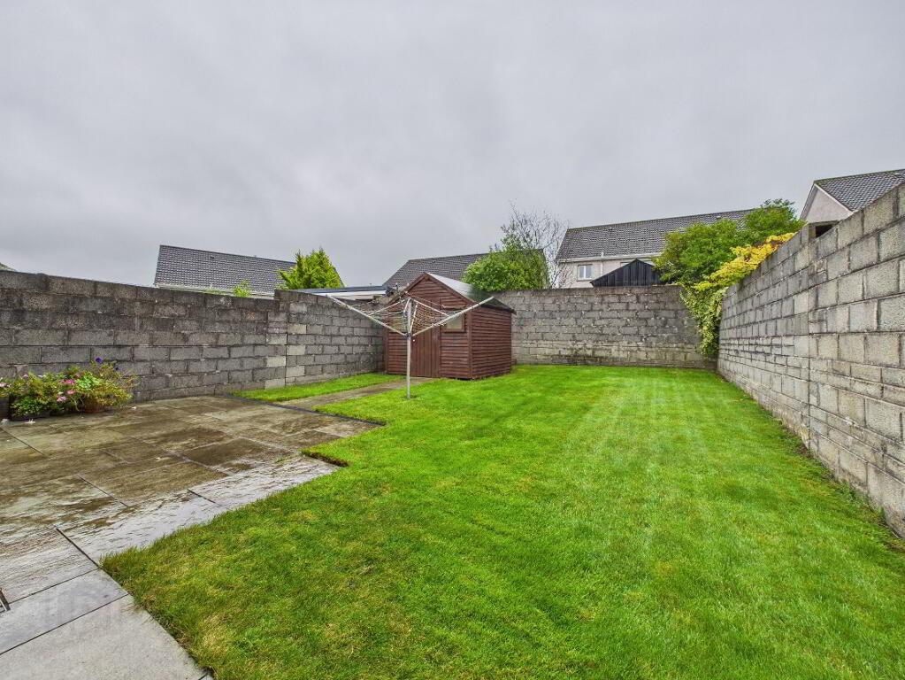 Large walled in rear garden laid out in grass with side entrance and patio area. Garden shed has electricity (lights and sockets) and is plumbed for washing machine and dryer.