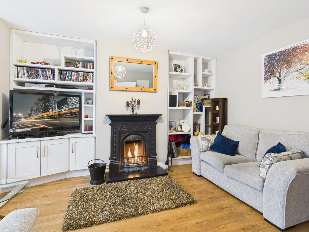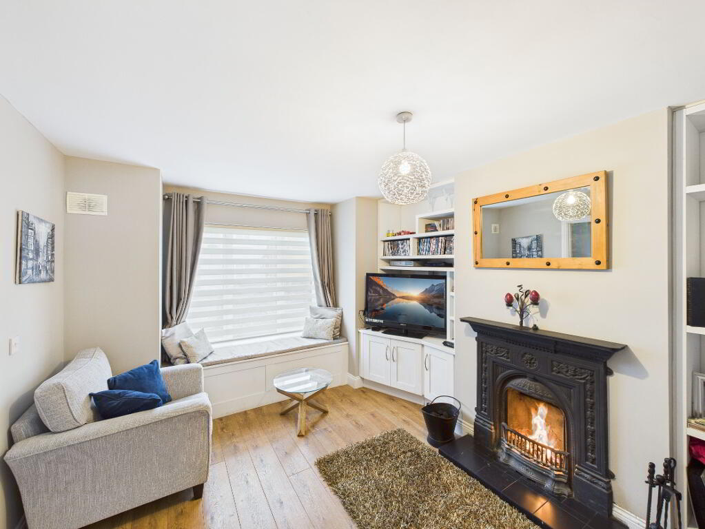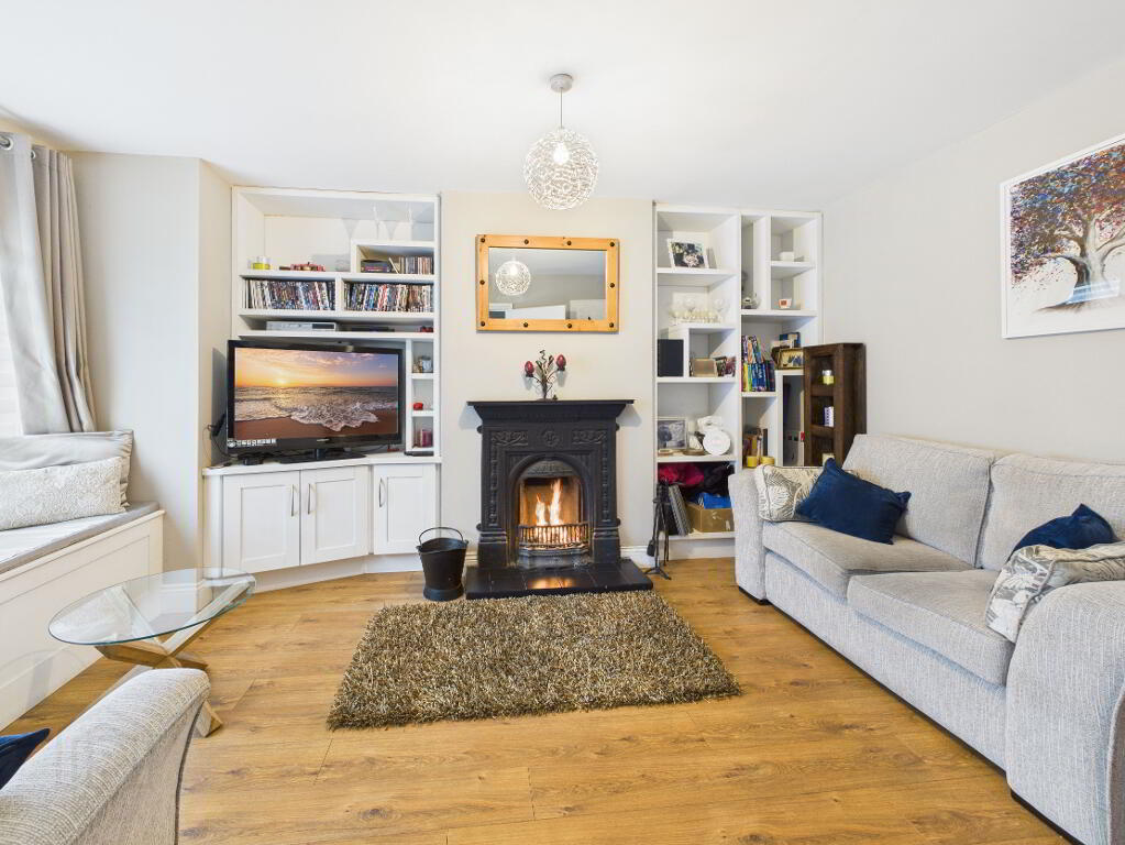 Laminate timber flooring. Radiator. Cast iron fireplace with tiled hearth. Fully fitted fireside units with open shelving and storage. Bay window with window seat overlooking front garden.