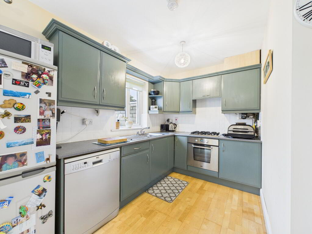 Built in electric cooker and gas hob. Tiled splashback. Semi–solid timber flooring. One window. Sliding Patio door leading to rear garden.