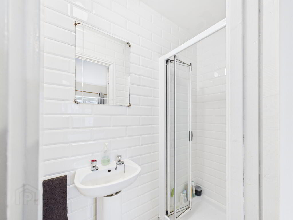 Fully tiled walls and flooring. Toilet. Wash hand basin with mirror. Walk in shower unit with electric shower.