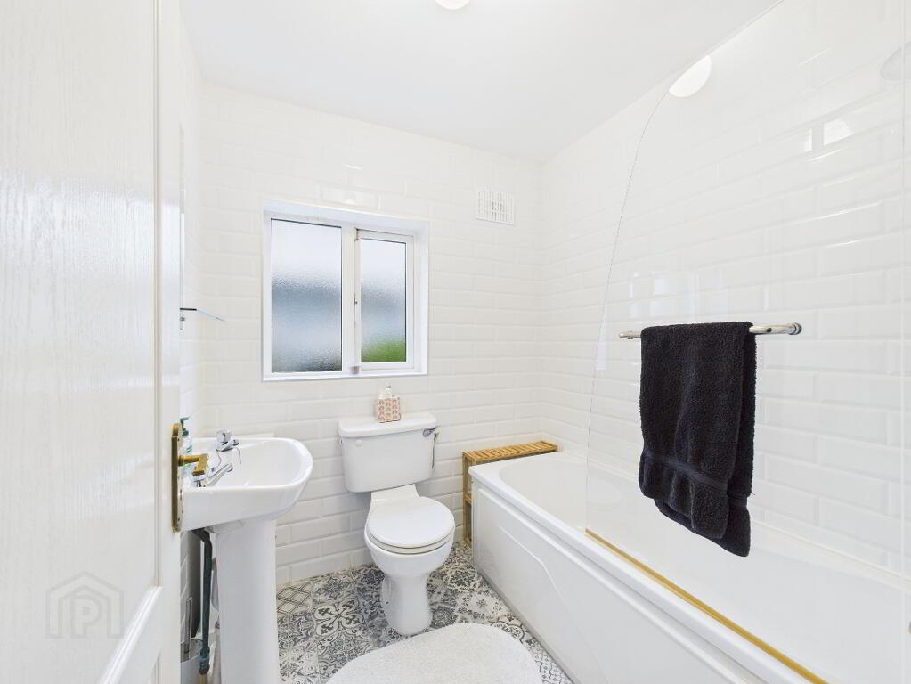 Fully tiled walls and flooring. Bath, toilet and wash hand basin. Mirror.