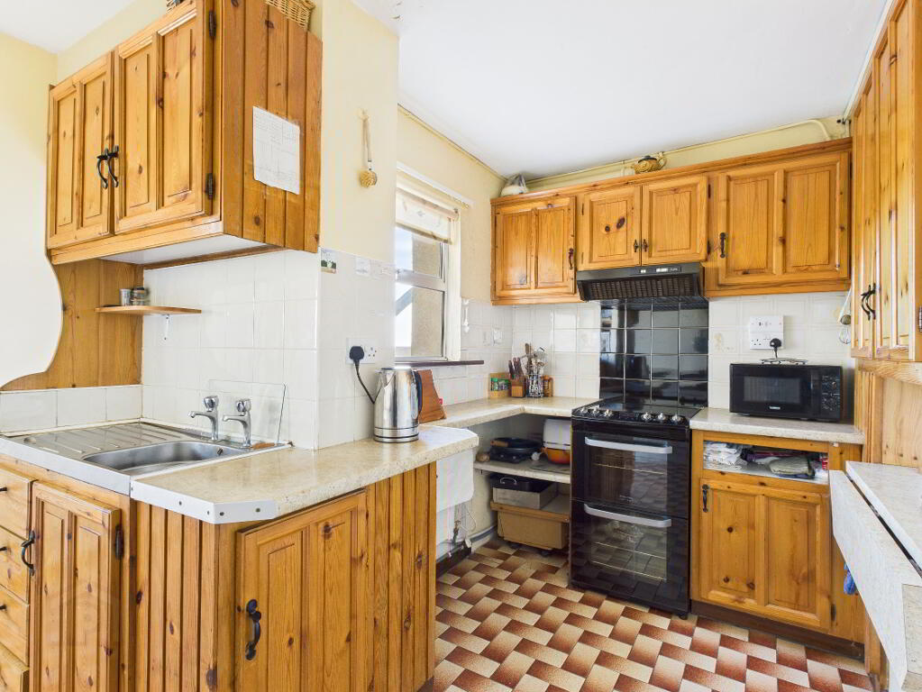 Tiled flooring. Fully fitted kitchen with wall and floor units. Tiled splashback. Two windows. Extractor hood. Stainless steel sink.