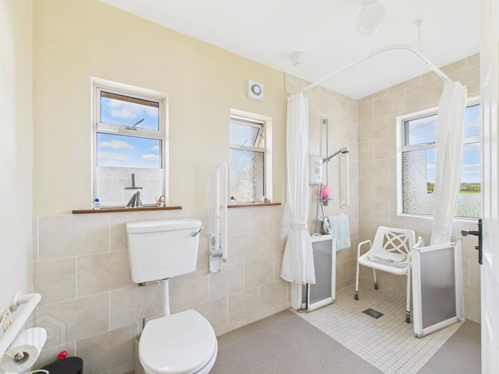 Fully tiled walls and floor. Toilet and wash hand basin. Shower unit with electric shower. Has disability access. Radiator. Three windows.