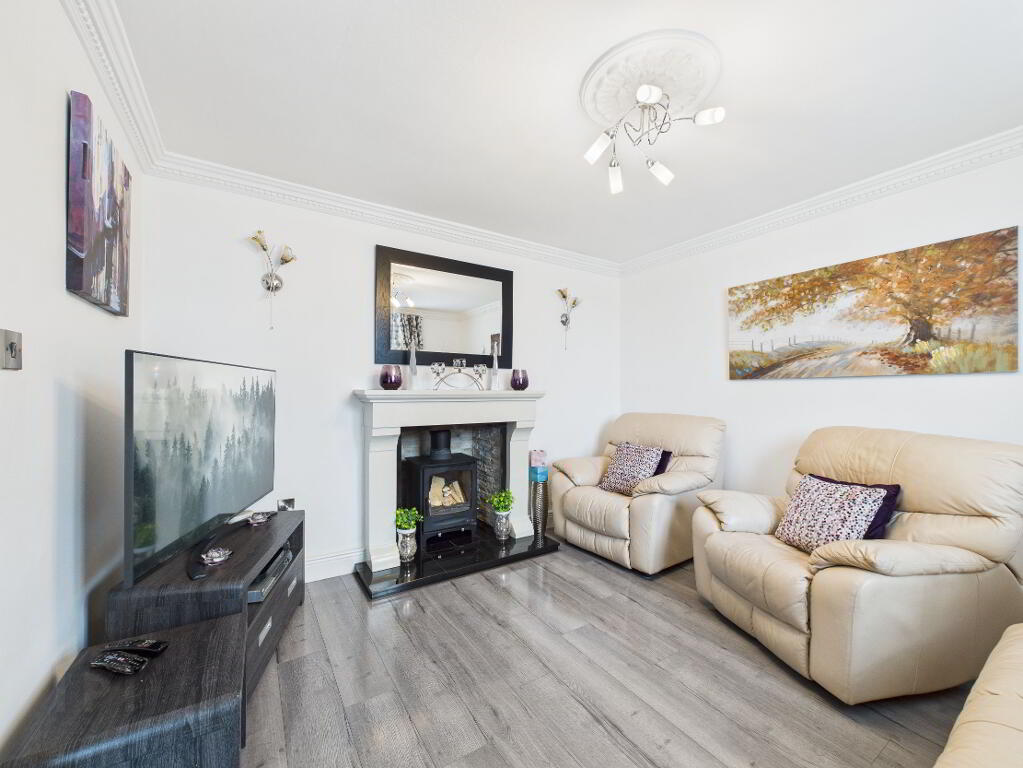 Laminate timber flooring. Radiator. Featured marble fireplace with granite hearth and recessed wood burning stove. Window. Cornicing and centre rose piece.