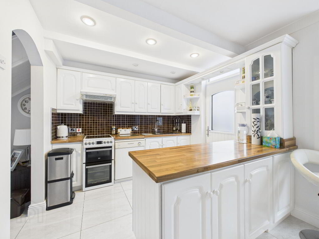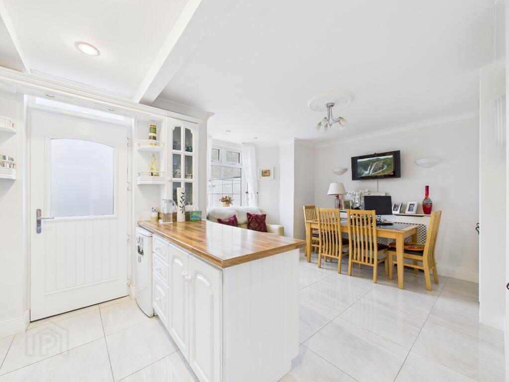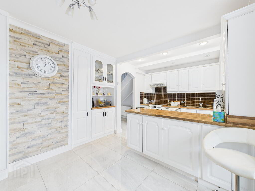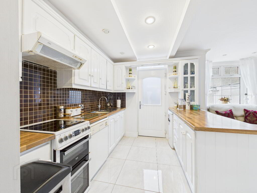 Fully fitted kitchen with wall and floor units. Tiled splashback. Timber effect worktop. PVC door to rear garden.