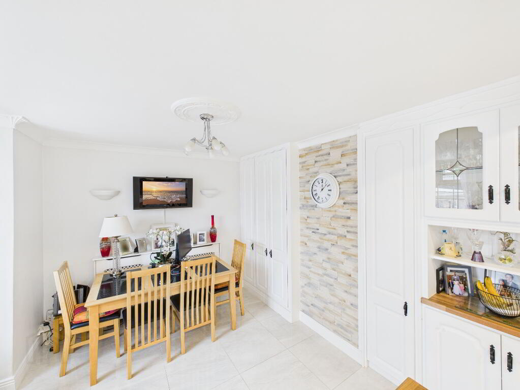 Featured bay window overlooking rear garden with recessed lighting. Cornicing and centre rose piece. Radiator with cover. Built in unit incorporating hot press.