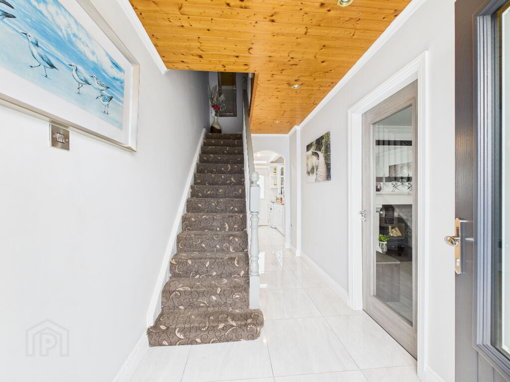 Composite front door with centre glass panel, side glass panels and glass overhead. Tiled flooring. Pine ceiling with recessed lighting. Radiator. Glass panel door to living room. Archway to kitchen-dining room.