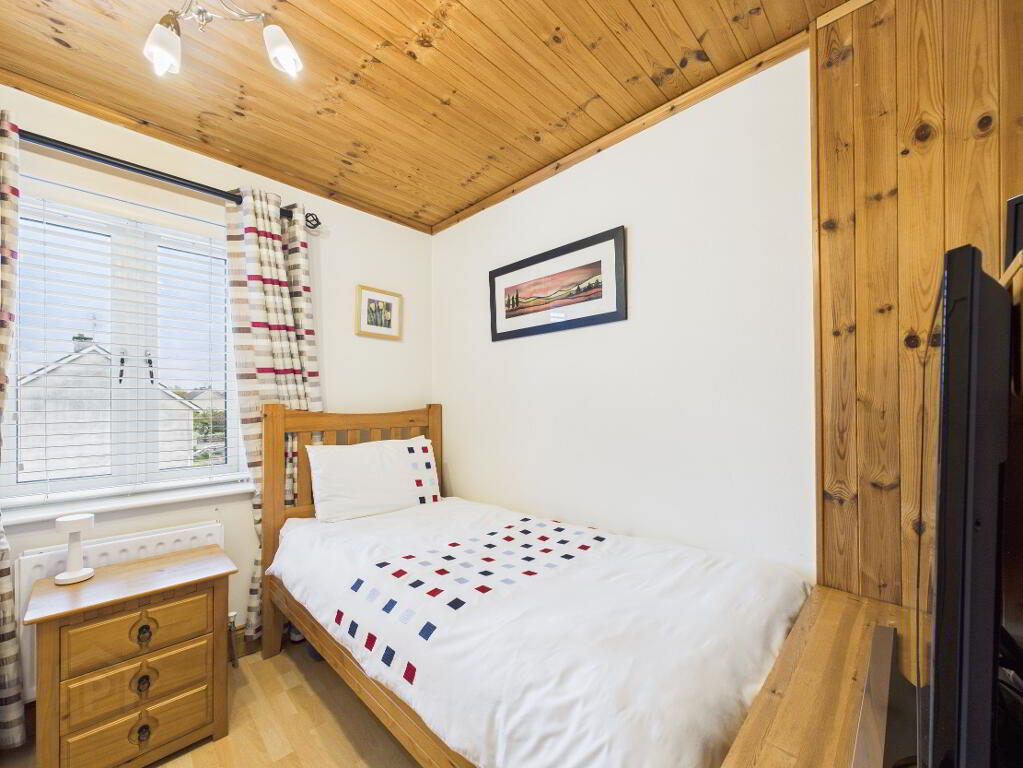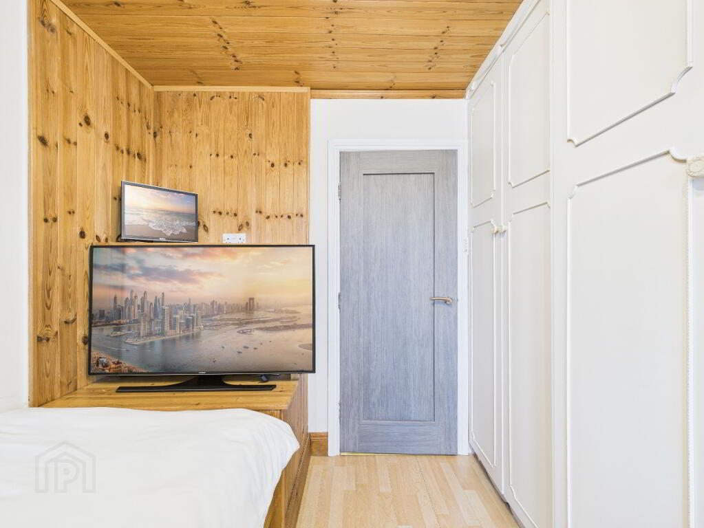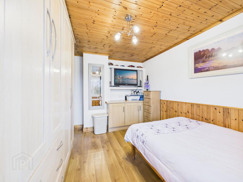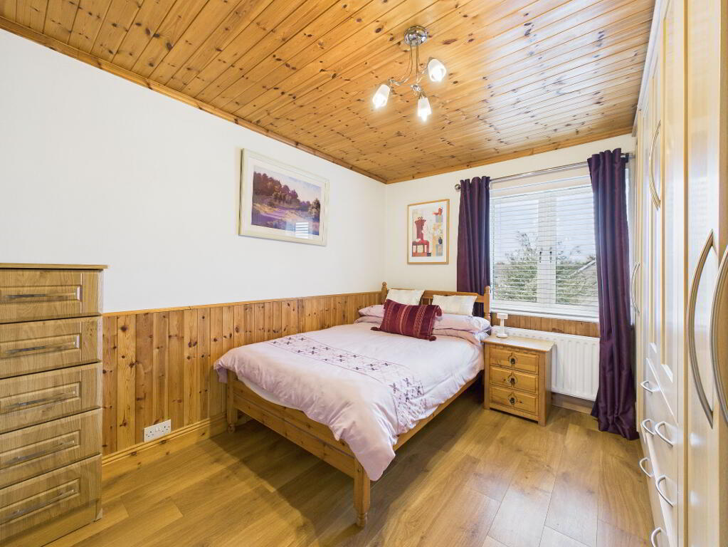 Timber flooring. Window. Radiator. Fully fitted built in wardrobe. Pine tongue and grooved ceiling with matching wall panelling.