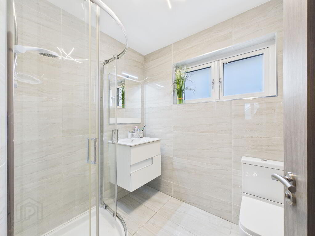 Fully tiled walls and floor. Toilet. Vanity unit with fitted mirror with light overhead. Walk in shower unit with electric shower. Window. Towel wall radiator.