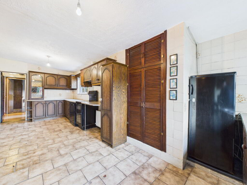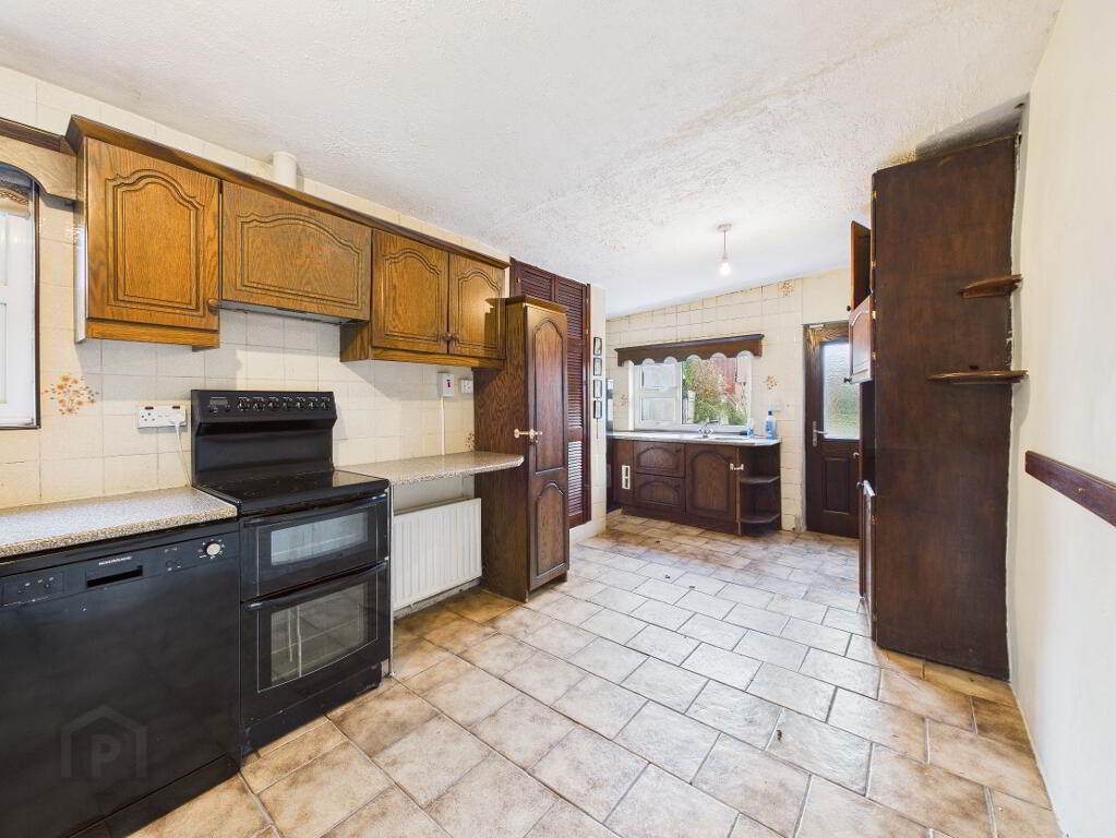 Tiled flooring. Fully fitted kitchen with wall and floor units. Tiled splashback. Two windows. Extractor hood. Stainless steel sink. Plumbed for dishwasher.