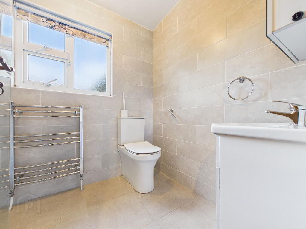 Fully tiled walls and floor. Toilet and wash hand basin. Shower unit with electric shower. Has disability access. Radiator. Three windows.