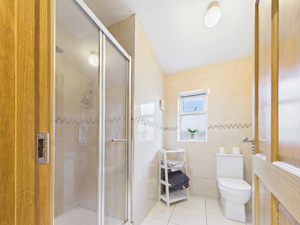 Fully tiled walls and flooring. Toilet. Vanity unit. Walk in shower unit with electric shower. Window. Towel wall radiator.